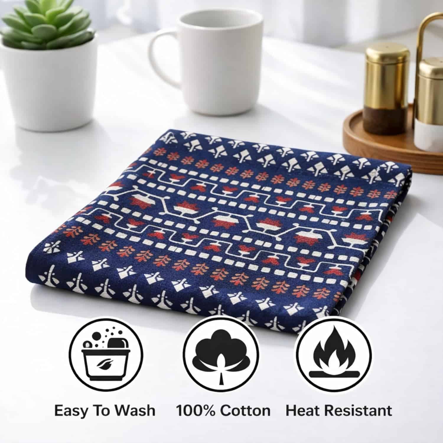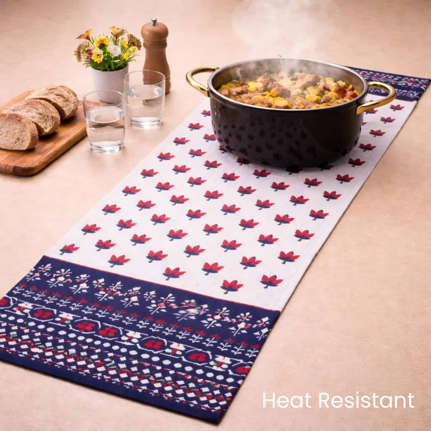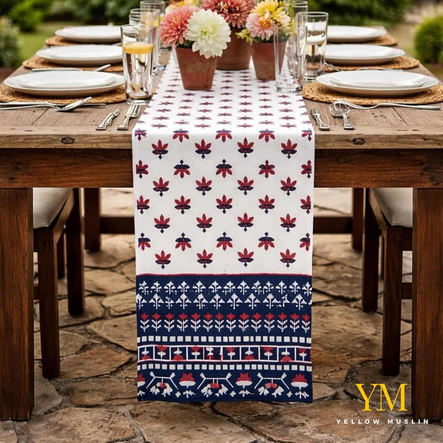 Crafted from premium-quality cotton, the fabric feels soft yet durable, making it perfect for daily use as well as special occasions. The elegant blue print enhances both minimal and statement interiors, making it a versatile addition to dining tables, coffee tables, consoles, and bedside surfaces.