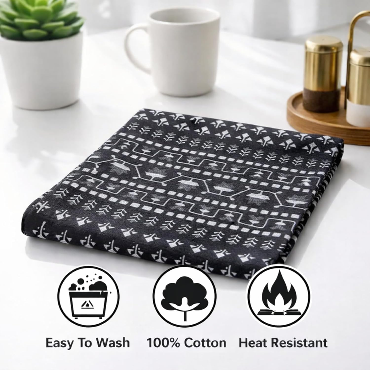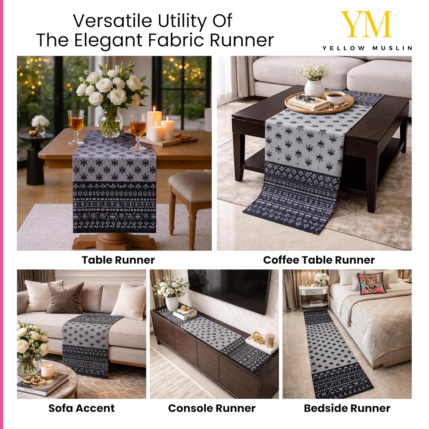 Crafted from high-quality breathable cotton, the runner offers a soft yet durable finish, making it suitable for everyday styling as well as special occasions. The sophisticated grey and black print complements minimal, monochrome, and modern interior themes, creating a polished and elevated look.