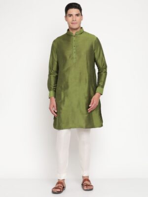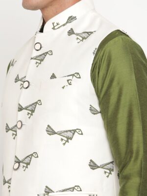 The kurta, crafted in luxurious olive-green silk, radiates effortless sophistication with its smooth texture and minimalist tailoring. Complementing it is a cream bandi (Nehru jacket) adorned with delicate green ethnic prints — a nod to India’s artisanal heritage while maintaining a clean, modern look. The Mandarin collar and front-button closure add to its regal charm, creating a balance between classic and contemporary style.