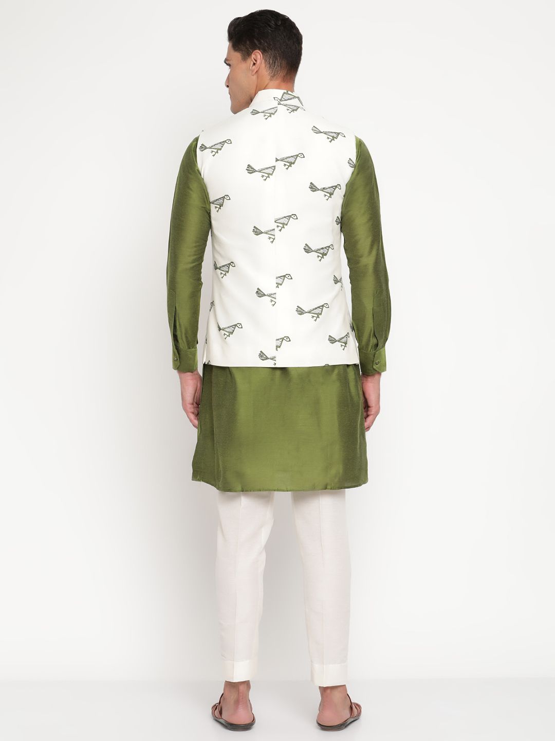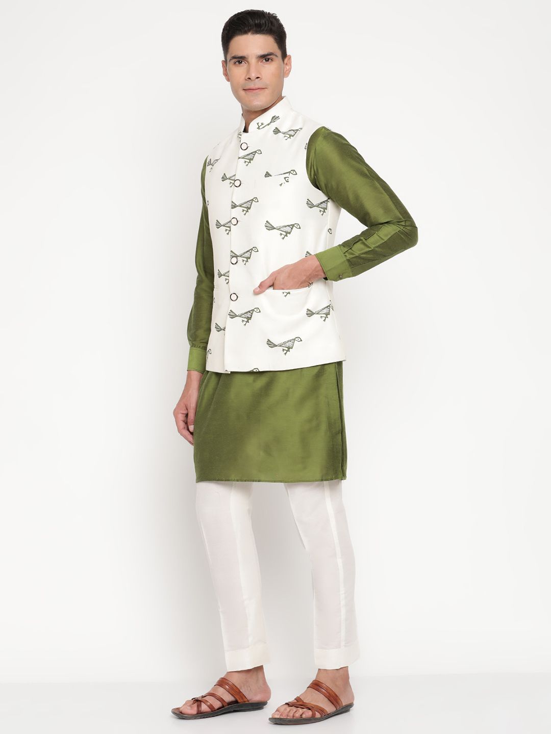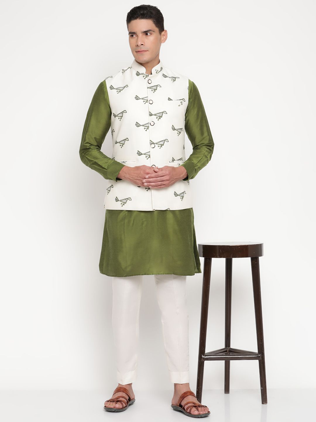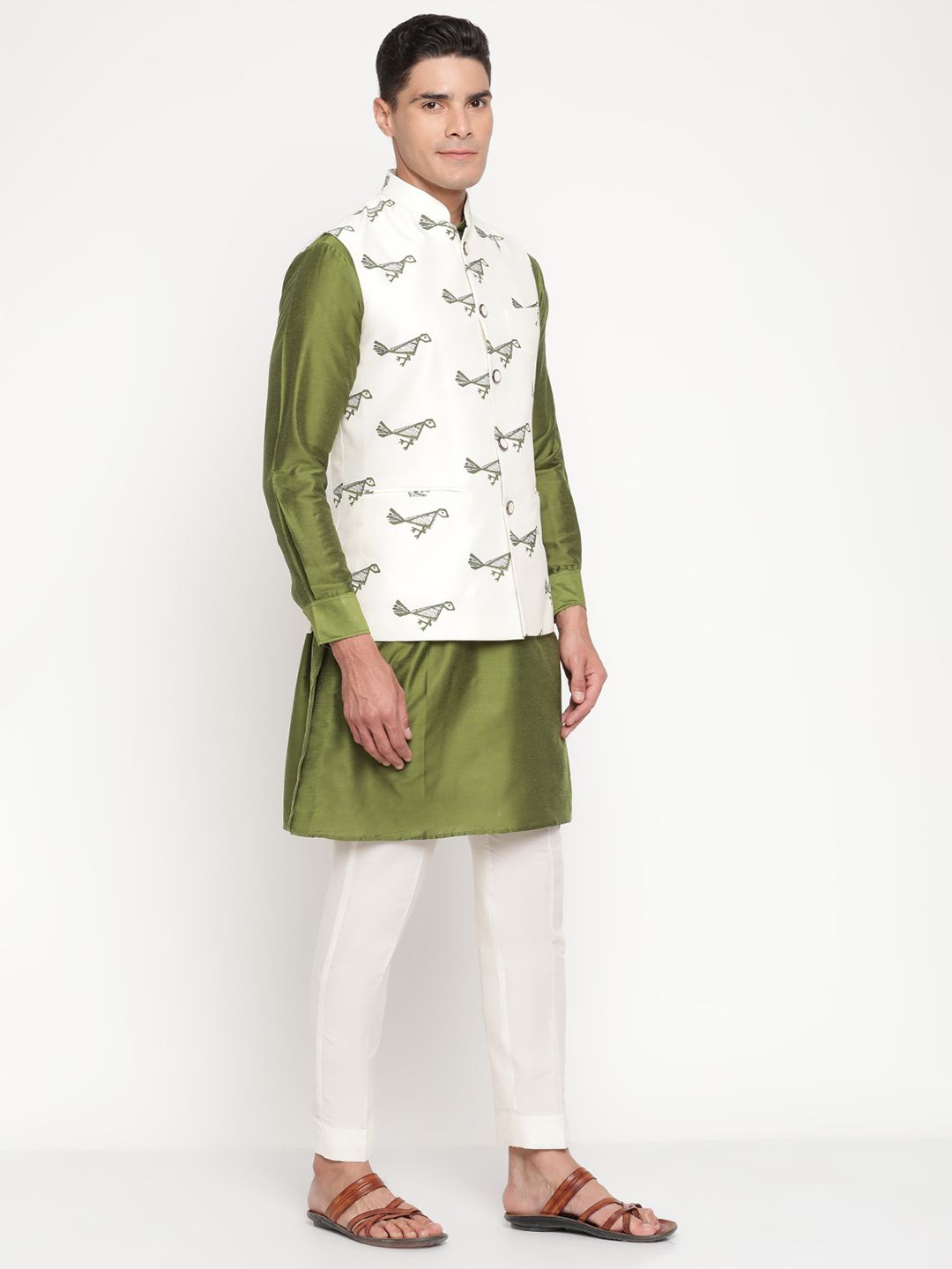 The kurta, crafted in luxurious olive-green silk, radiates effortless sophistication with its smooth texture and minimalist tailoring. Complementing it is a cream bandi (Nehru jacket) adorned with delicate green ethnic prints — a nod to India’s artisanal heritage while maintaining a clean, modern look. The Mandarin collar and front-button closure add to its regal charm, creating a balance between classic and contemporary style.