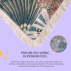 Sized at 18×18 inches, these throw pillows are well suited for sofas, beds, and accent seating areas. The velvet finish adds richness to the overall appearance, while the fringe detailing gives a refined decorative edge. The tropical abstract pattern makes them a strong visual accent piece for layered cushion styling.