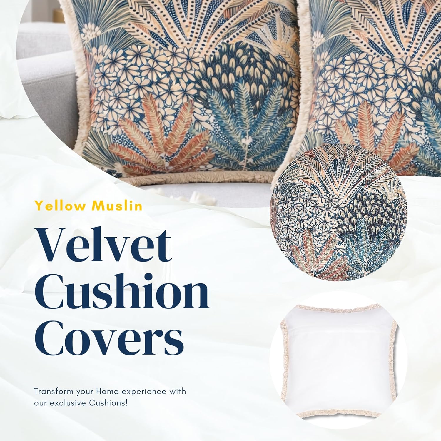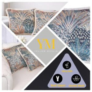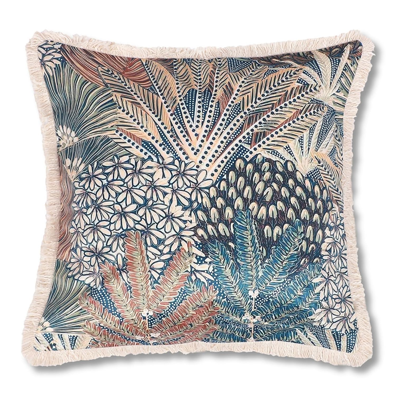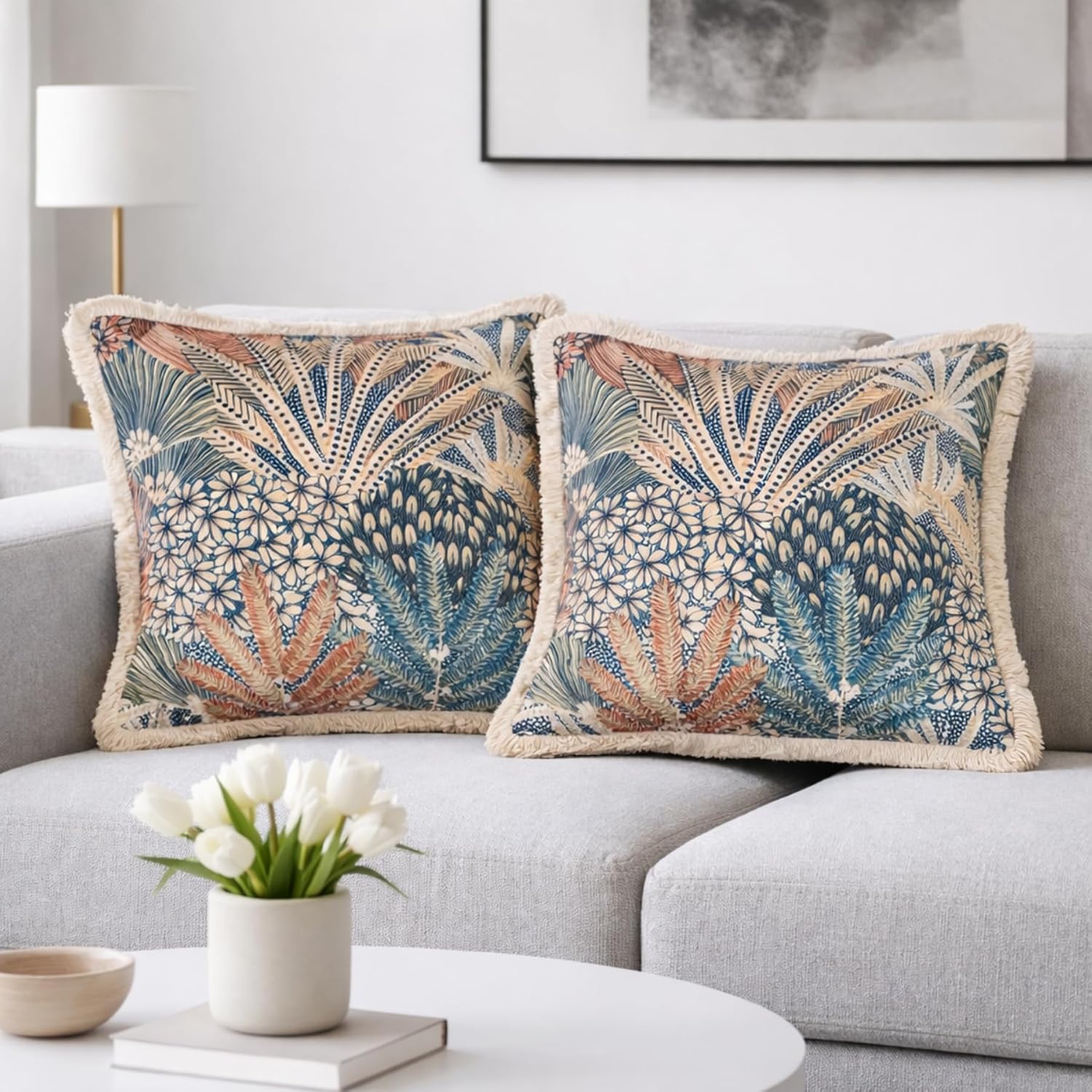 Sized at 18×18 inches, these throw pillows are well suited for sofas, beds, and accent seating areas. The velvet finish adds richness to the overall appearance, while the fringe detailing gives a refined decorative edge. The tropical abstract pattern makes them a strong visual accent piece for layered cushion styling.