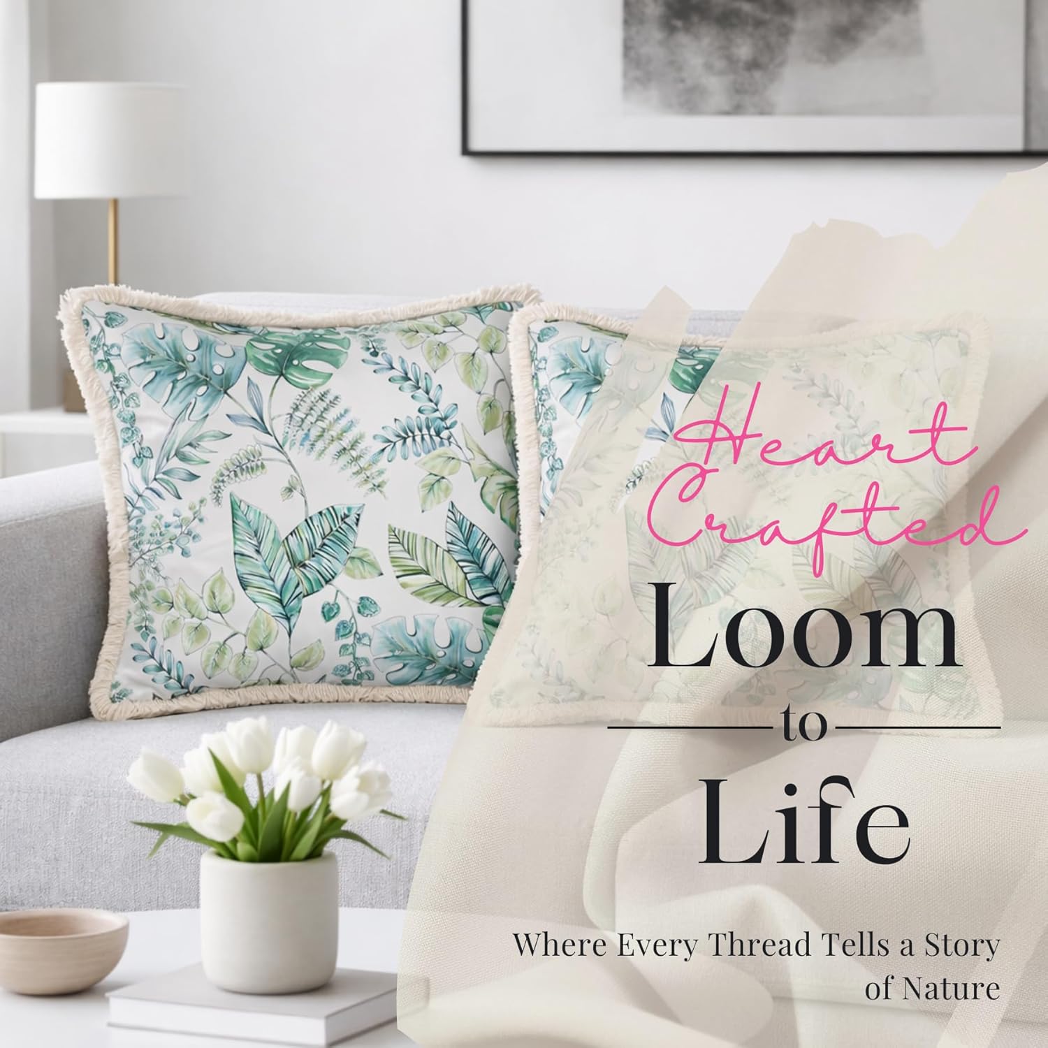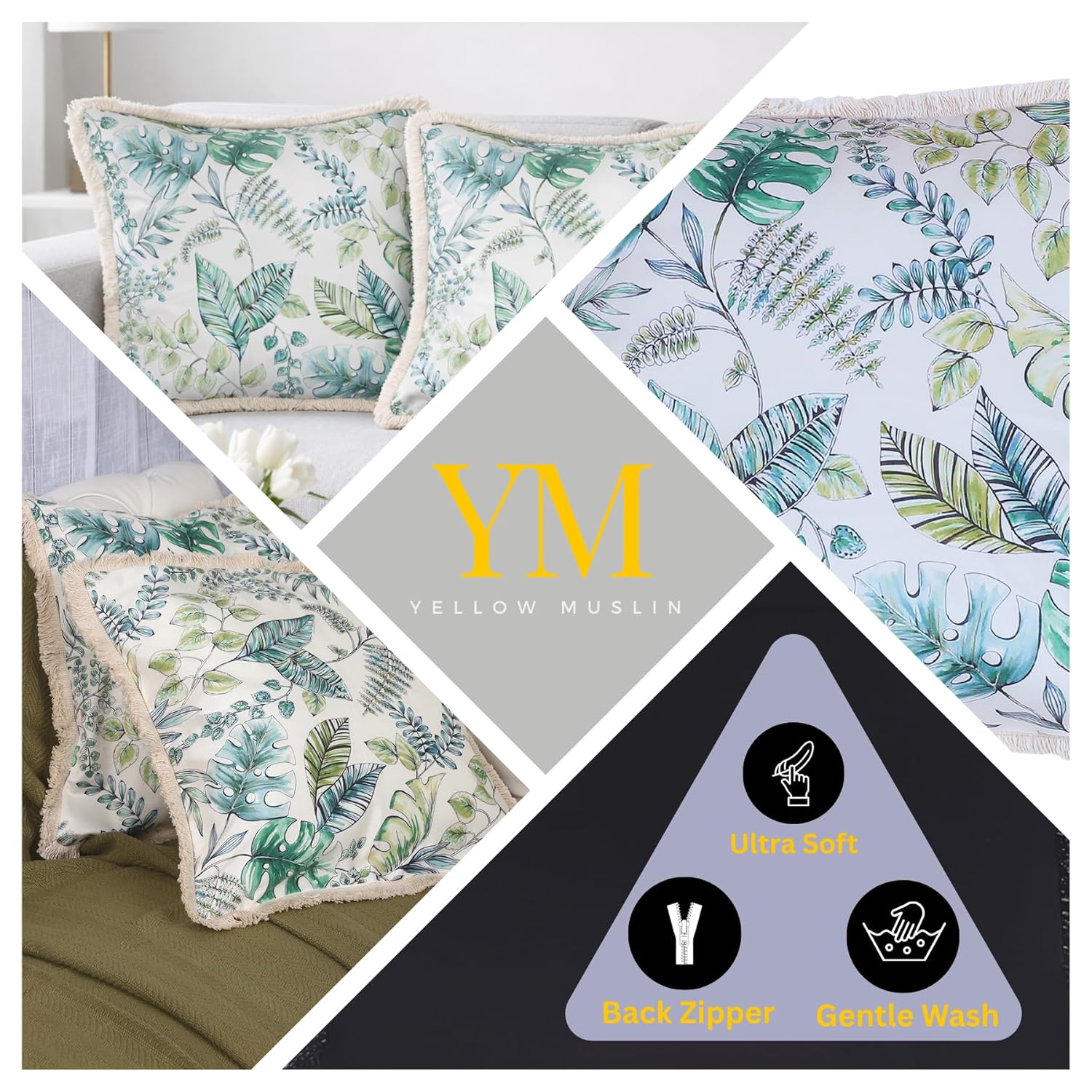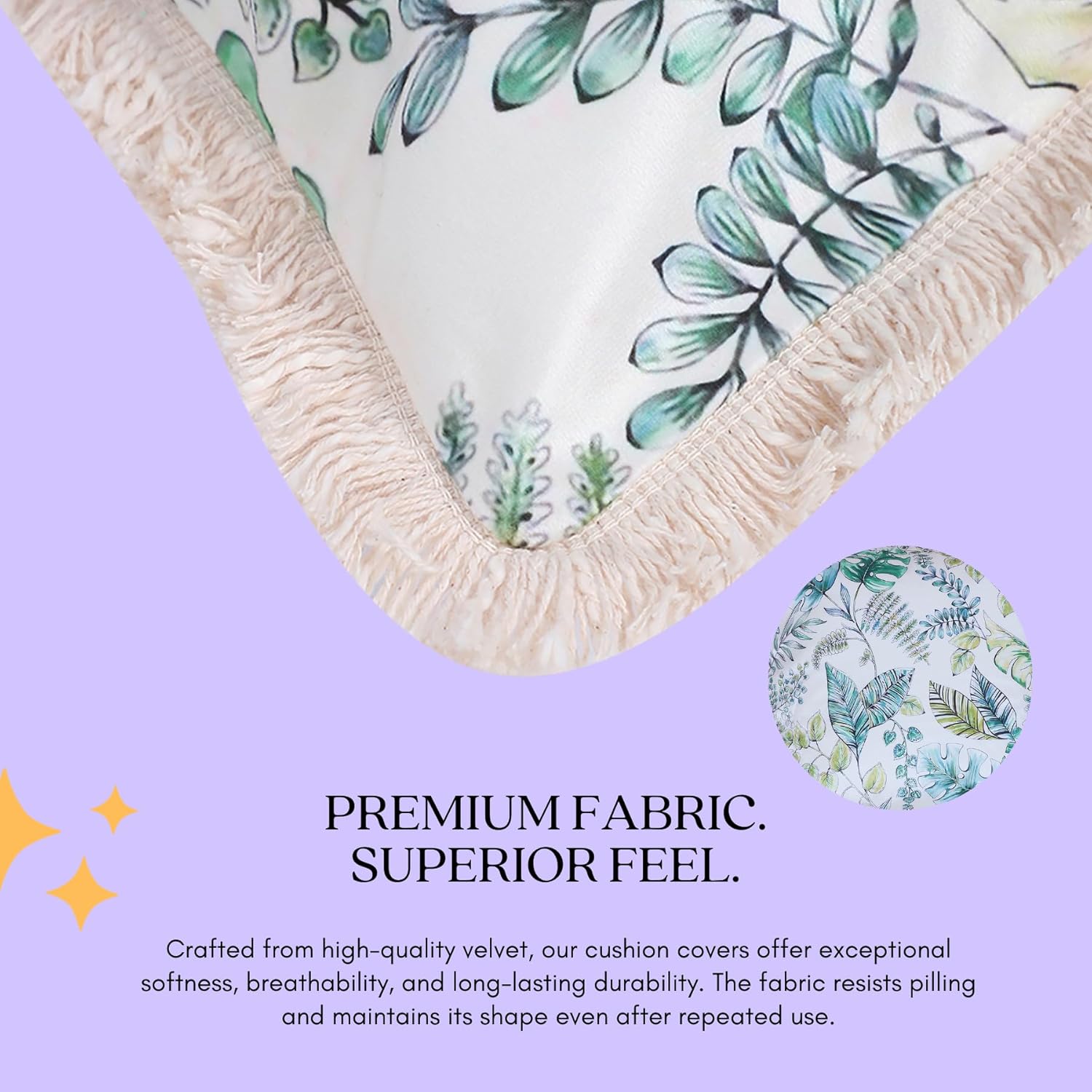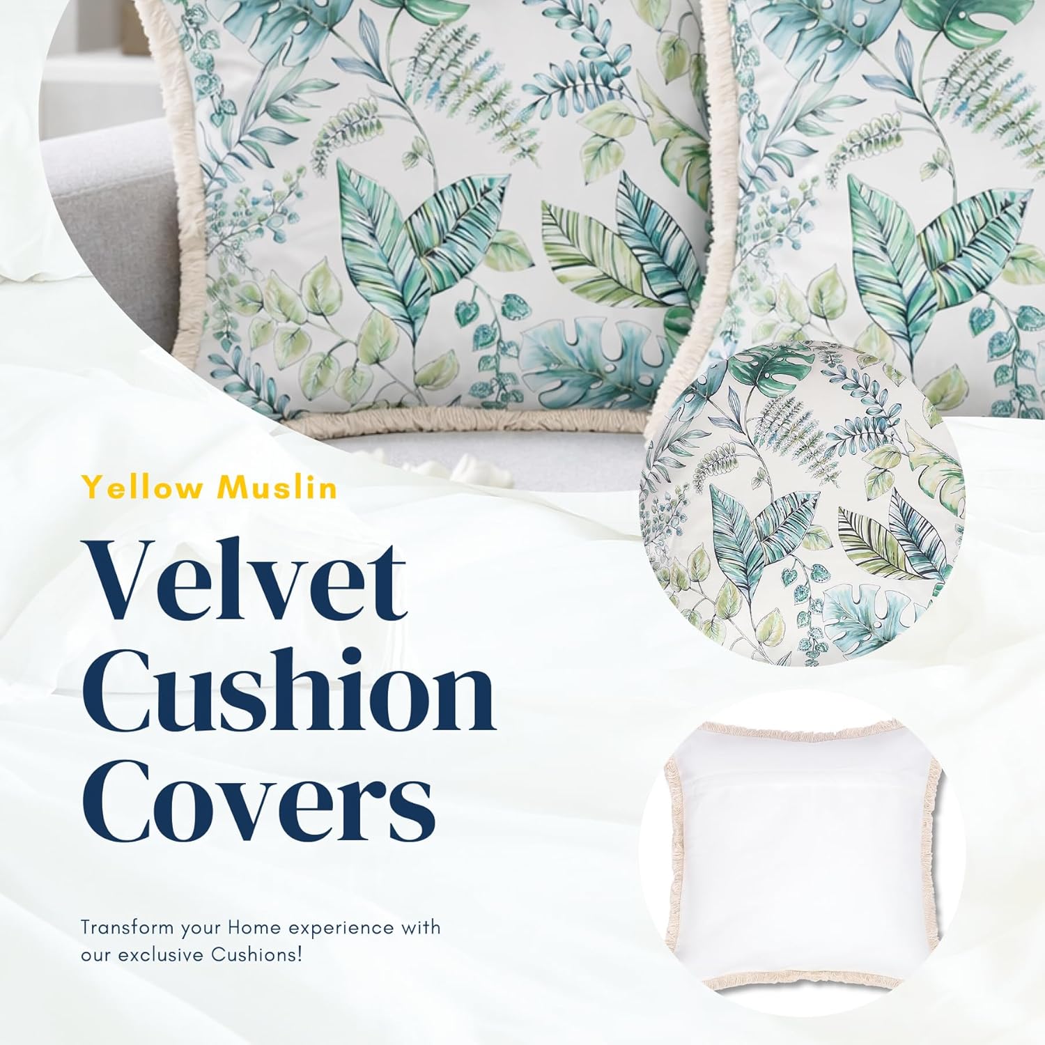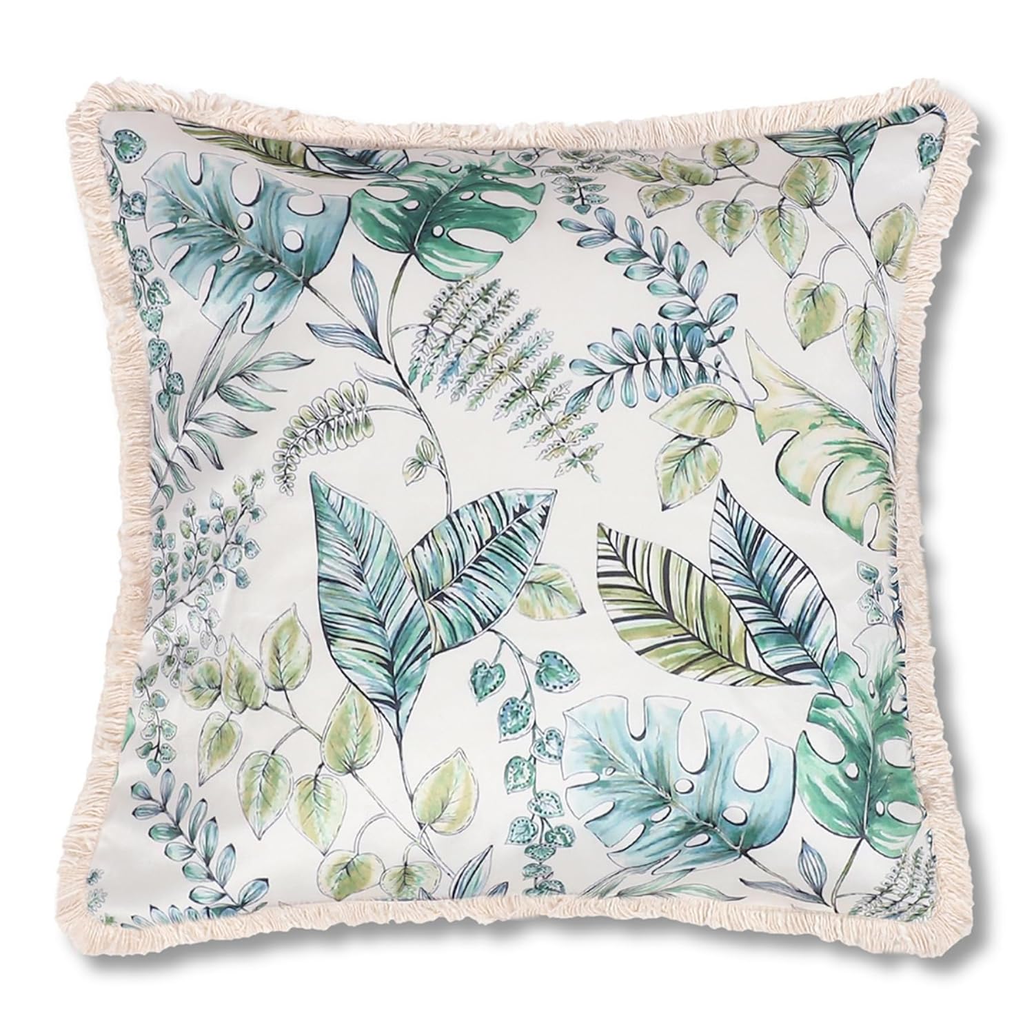 Each pillow measures 18×18 inches, making them ideal for larger cushion layouts and layered décor styling. The velvet finish adds a rich, premium look, while the fringe detailing enhances the decorative edge. The abstract tropical pattern pairs well with both contemporary and luxury interior themes.