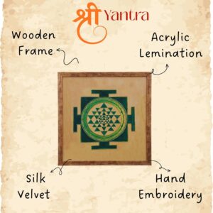 Bring spiritual elegance into your home with the Yellow Muslin Hand-Embroidered Shri Yantra Wall Art (Green). This decorative piece features intricate hand-stitched embroidery on soft velvet, beautifully capturing the sacred Shri Yantra design. It is encased in a sturdy wooden frame with an antique gold finish and protected by shatter-resistant acrylic glass for long-lasting beauty.