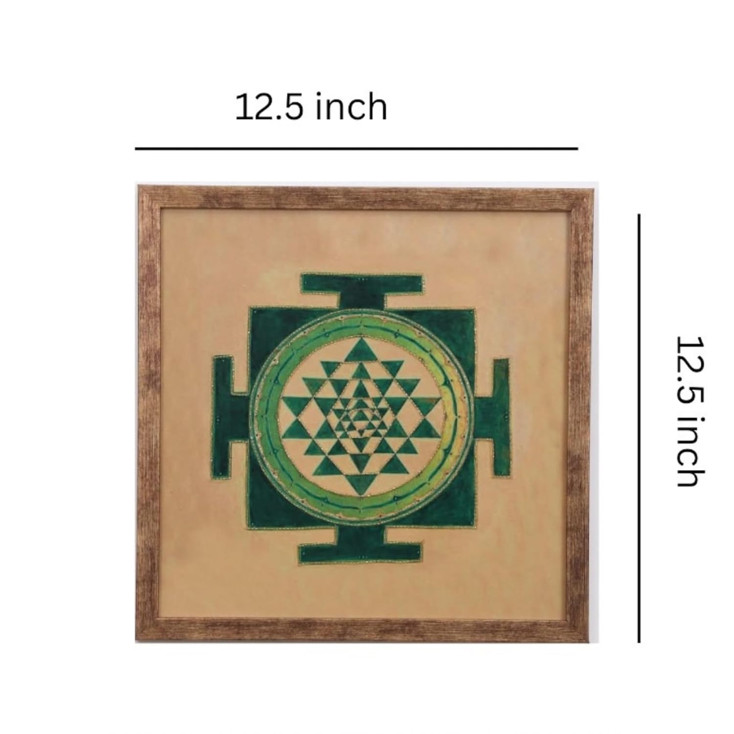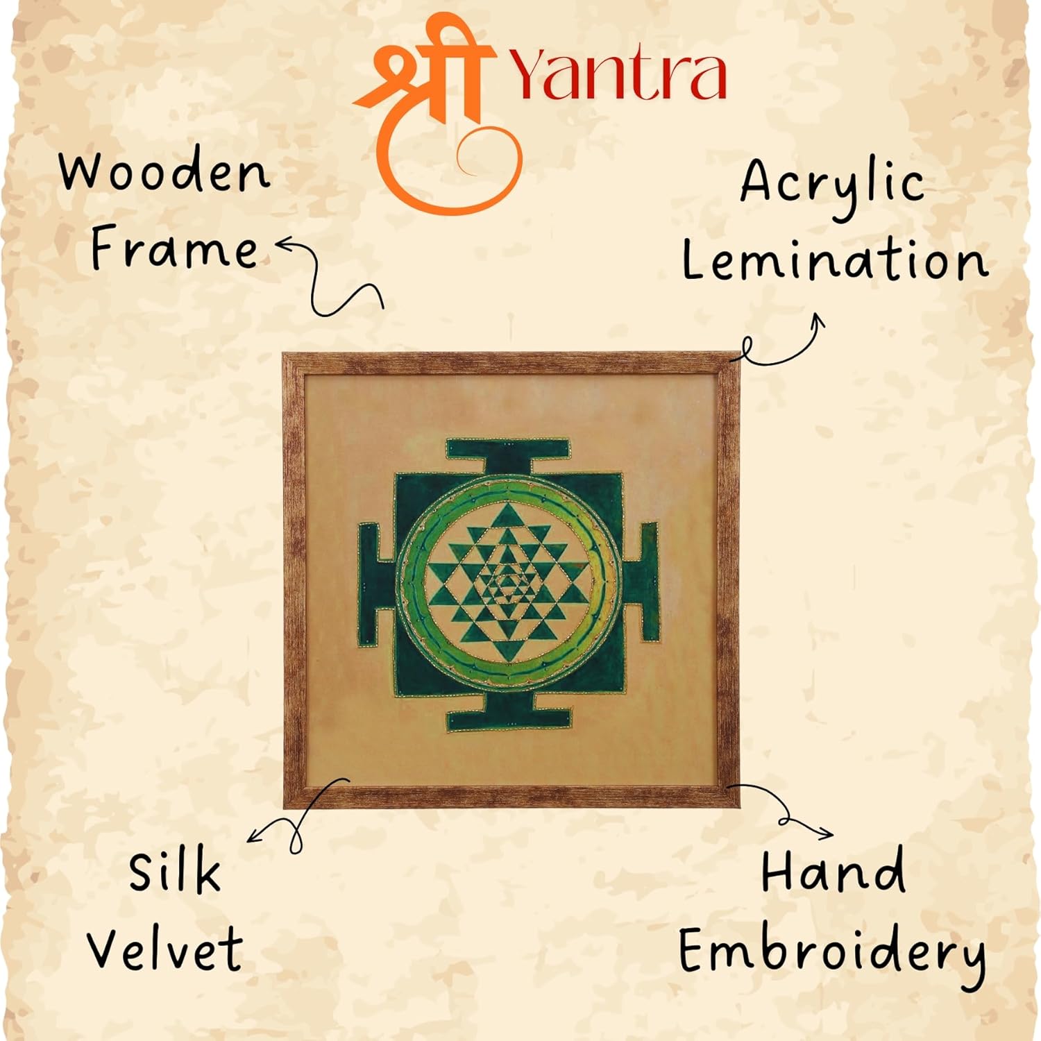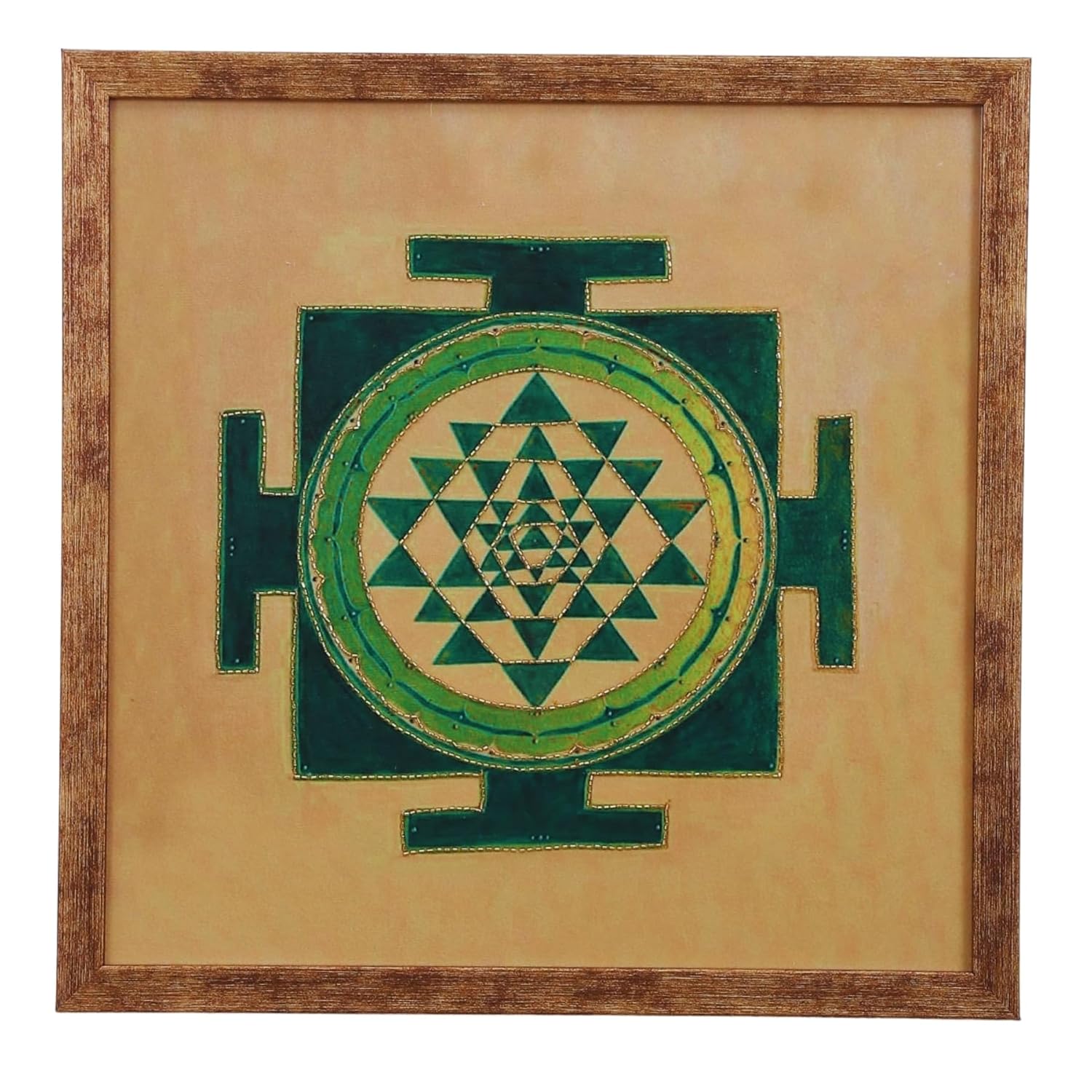 Bring spiritual elegance into your home with the Yellow Muslin Hand-Embroidered Shri Yantra Wall Art (Green). This decorative piece features intricate hand-stitched embroidery on soft velvet, beautifully capturing the sacred Shri Yantra design. It is encased in a sturdy wooden frame with an antique gold finish and protected by shatter-resistant acrylic glass for long-lasting beauty.