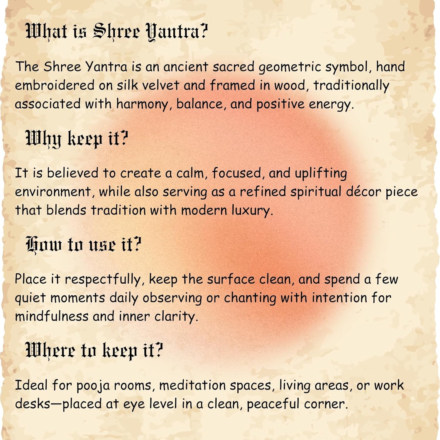 Each Shri Yantra wall art is hand-embroidered, so minor variations in stitching or color are natural and reflect the uniqueness of each piece. Handle carefully to maintain frame and fabric quality.