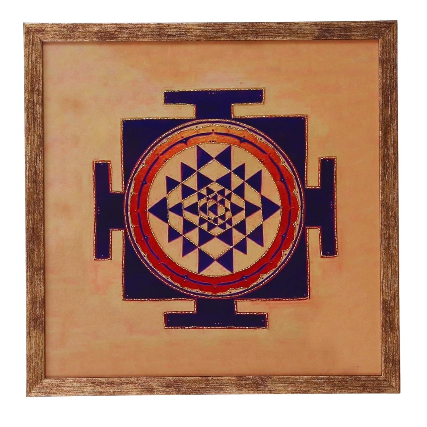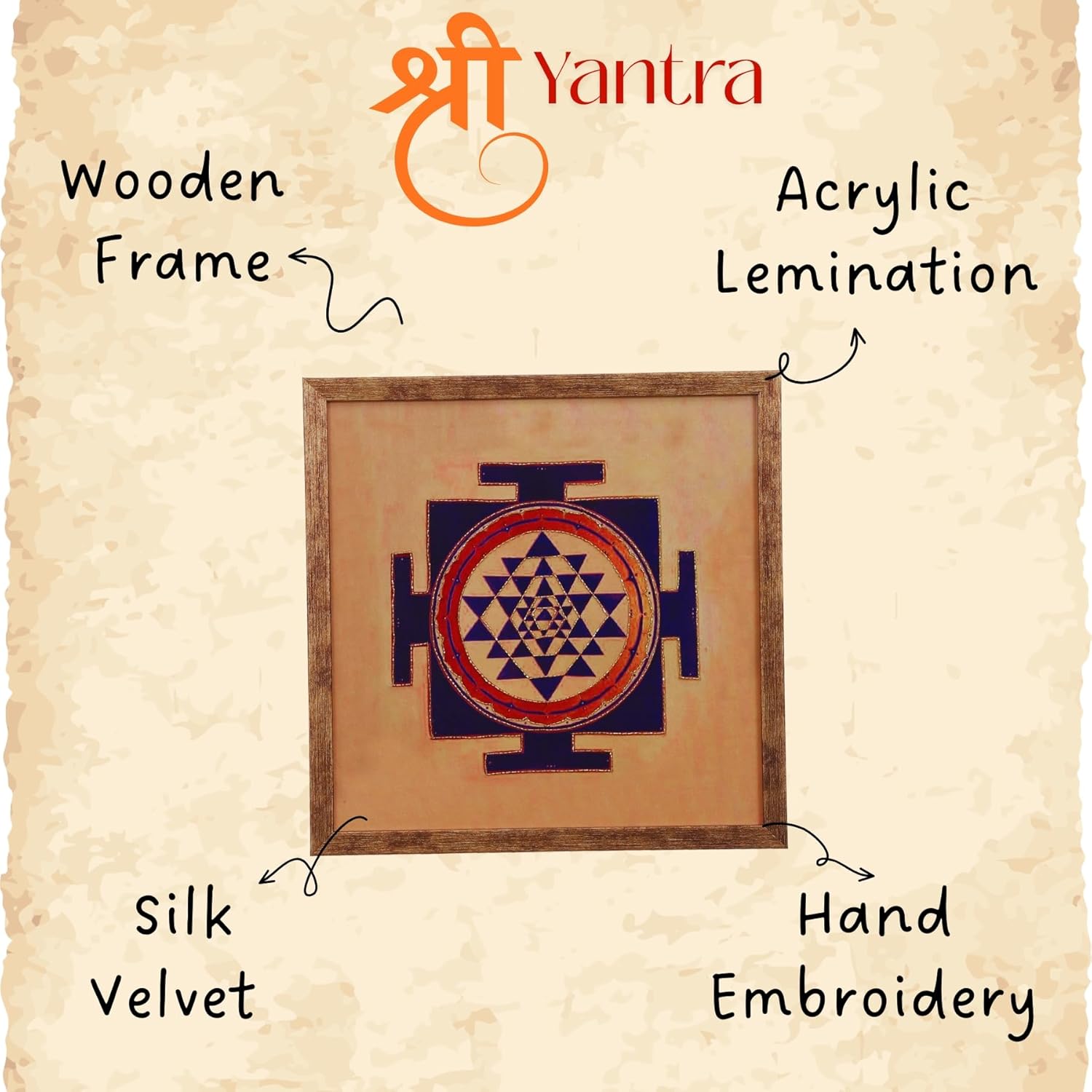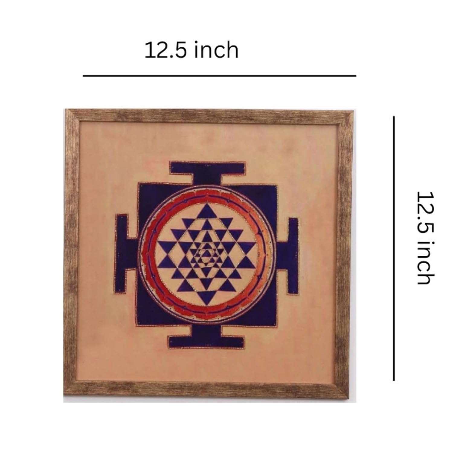 Each Shri Yantra wall art is hand-embroidered, so minor variations in embroidery and color are natural, highlighting the uniqueness of each piece. Handle with care to maintain fabric and frame quality.