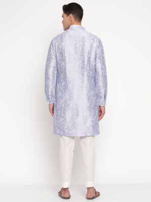 Elevate your ethnic wardrobe with this exquisite Yellow Muslin Men’s Light Blue Jacquard Kurta by Designer Niharika Pandey. Crafted from rich jacquard fabric, the kurta features a subtle floral pattern in a serene light blue tone, offering a perfect balance of luxury and sophistication.