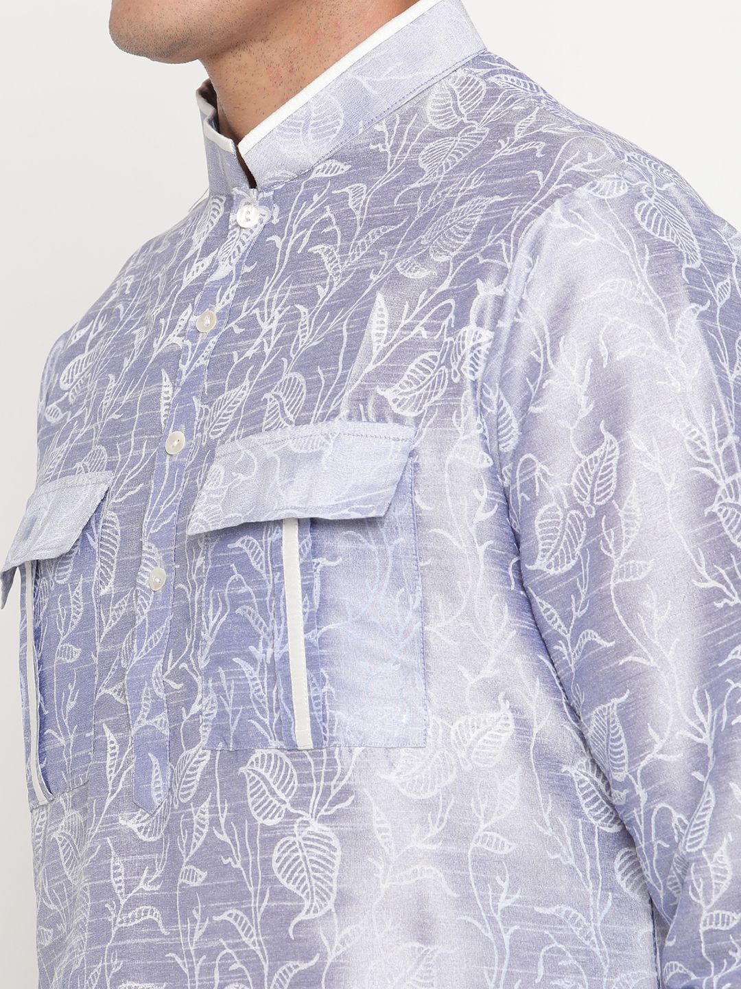 The design is enhanced with a mandarin collar, buttoned placket, and distinctive chest flap-pocket detailing, adding a modern twist to a classic silhouette. Lightweight yet refined, the jacquard texture makes it ideal for special occasions, ensuring both comfort and style throughout the day.