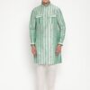 The kurta’s mandarin collar, button-down front, and dual flap pockets offer a stylish modern upgrade while ensuring traditional charm. The soft off-white pajama balances the vibrant kurta, making it ideal for daytime weddings, festive gatherings, cultural celebrations, or sangeet evenings.