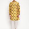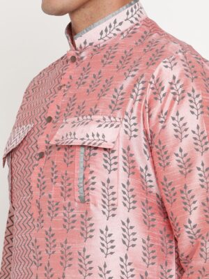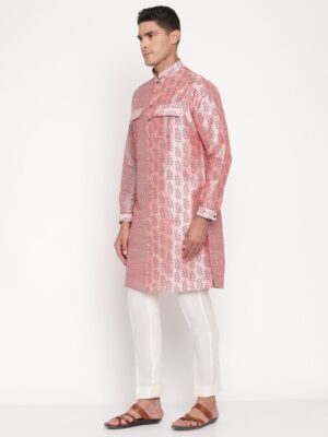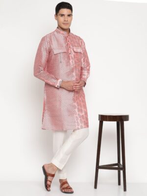 Add a touch of refined elegance to your ethnic wardrobe with the Yellow Muslin Men’s Pink Dual-Pattern Silk Kurta (only) Designer Niharika Pandey.