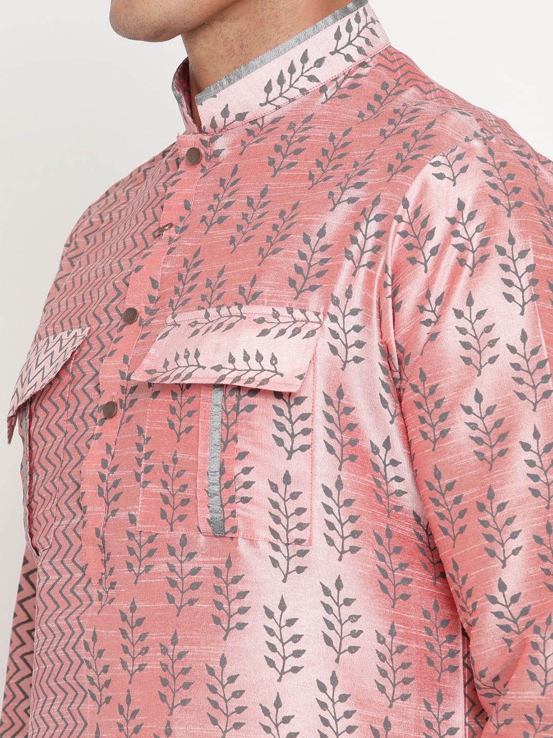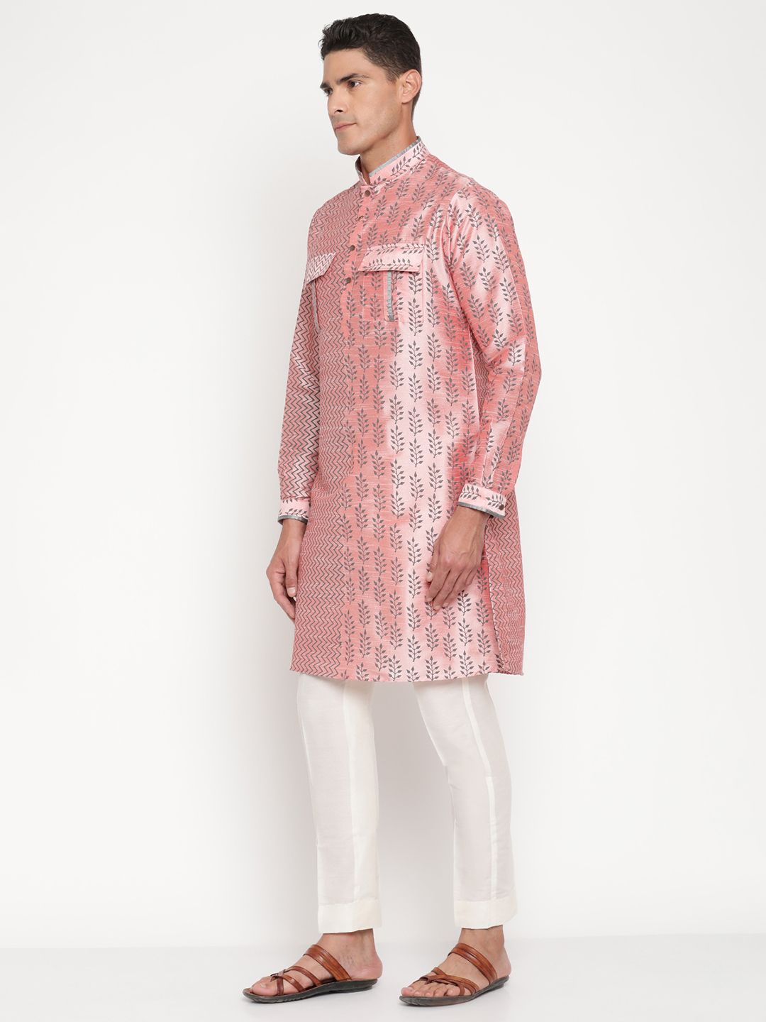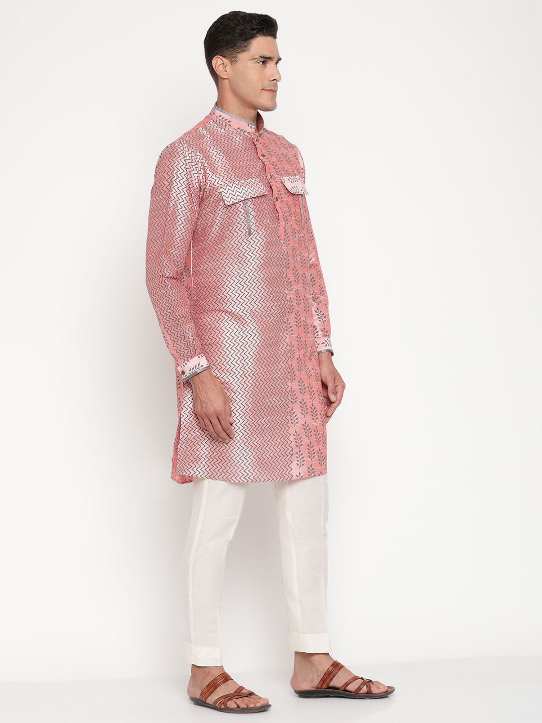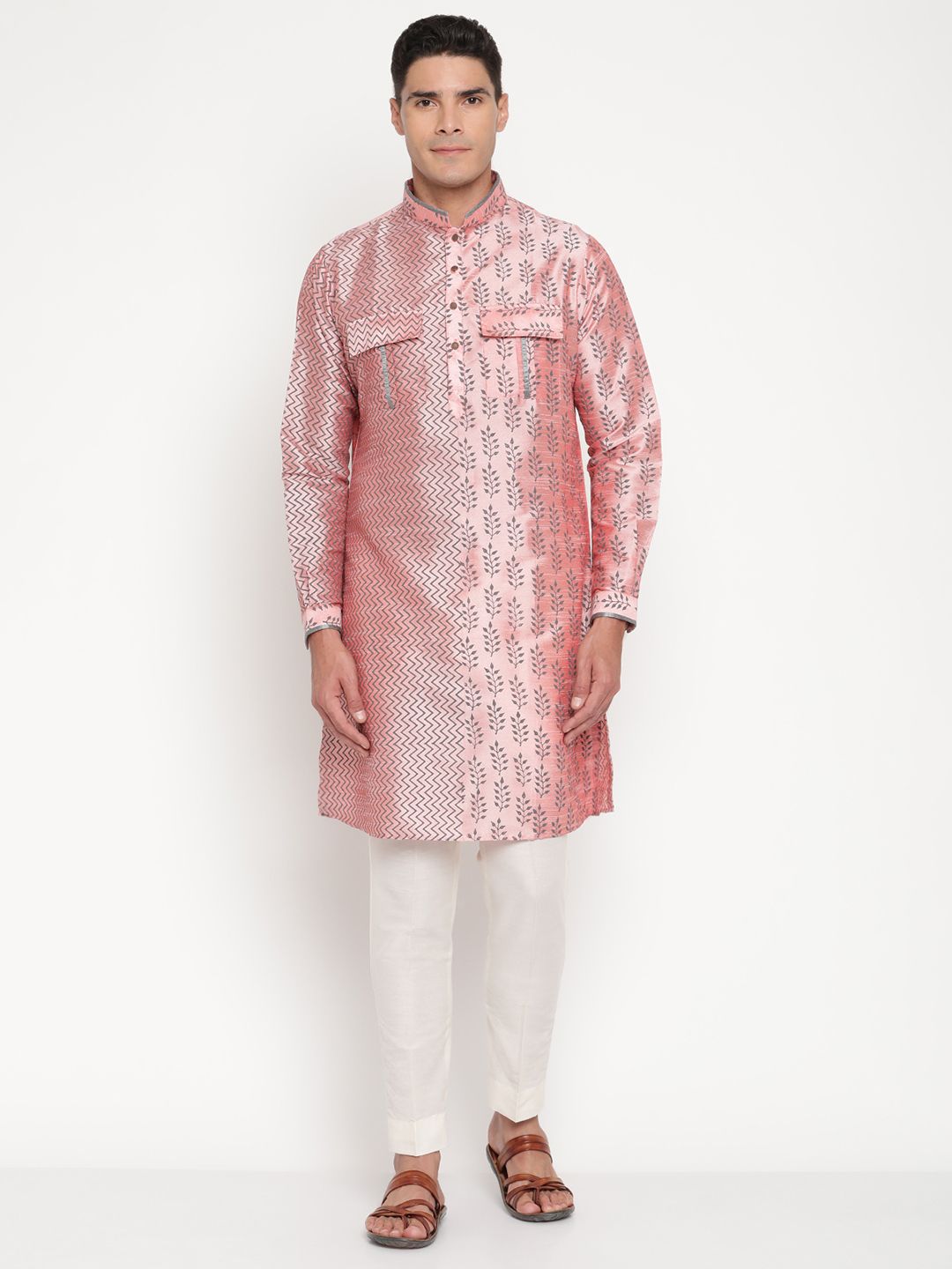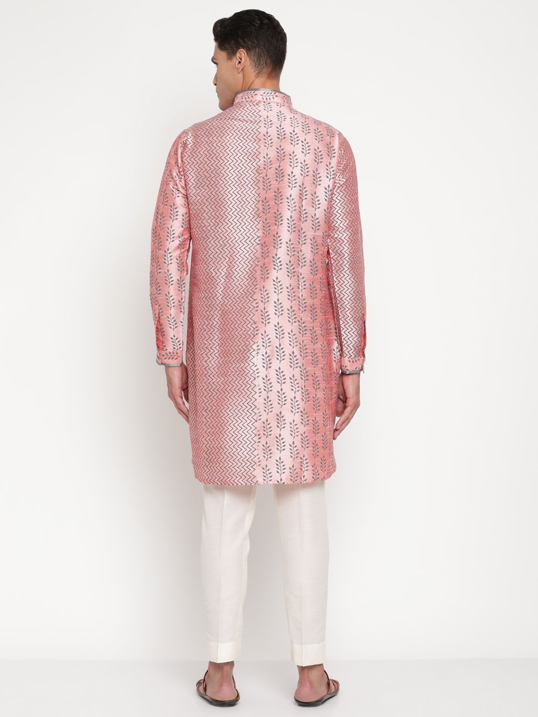 This premium silk-blend kurta showcases a unique two-tone woven pattern – one side featuring subtle zig-zag lines and the other adorned with delicate floral motifs – creating a truly standout festive look.